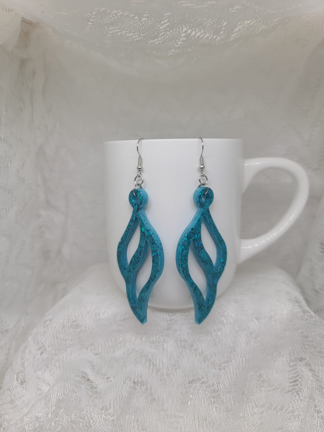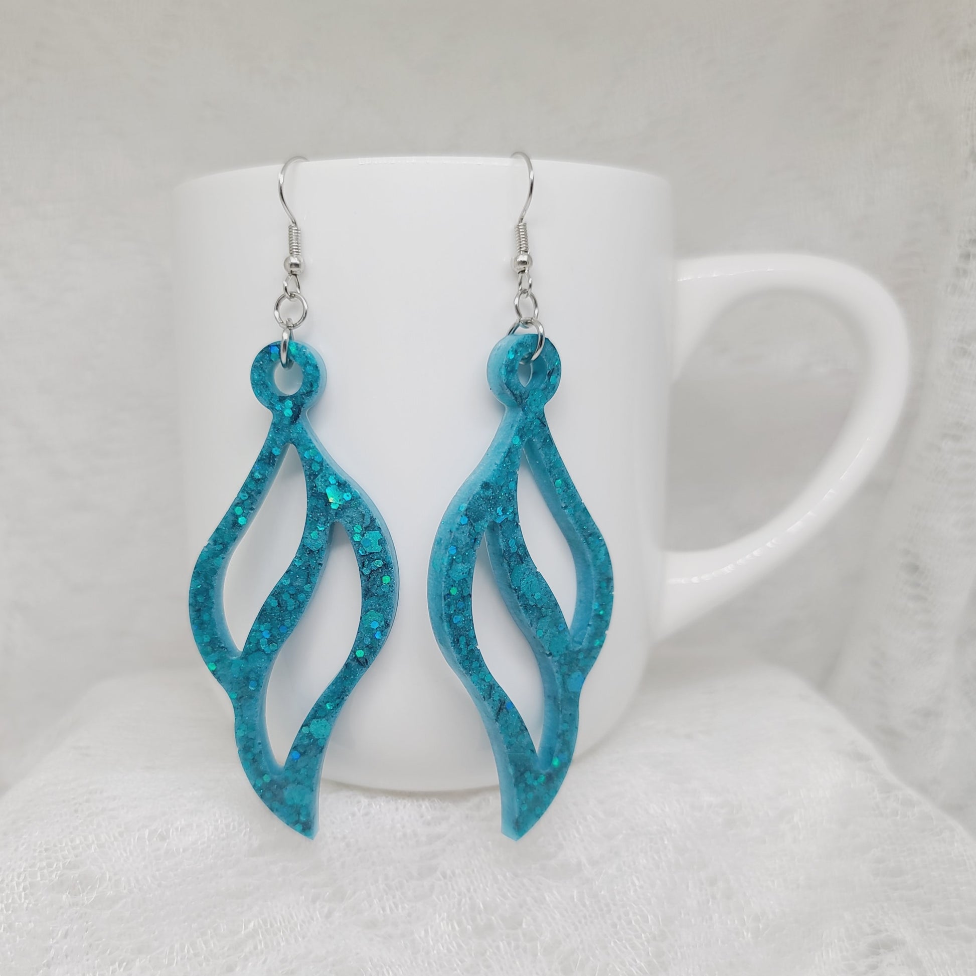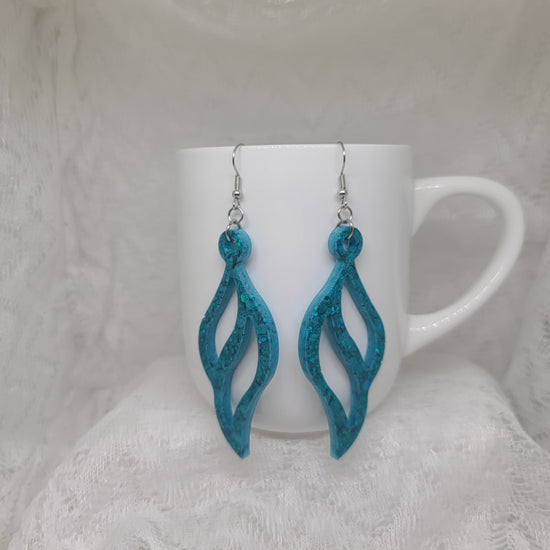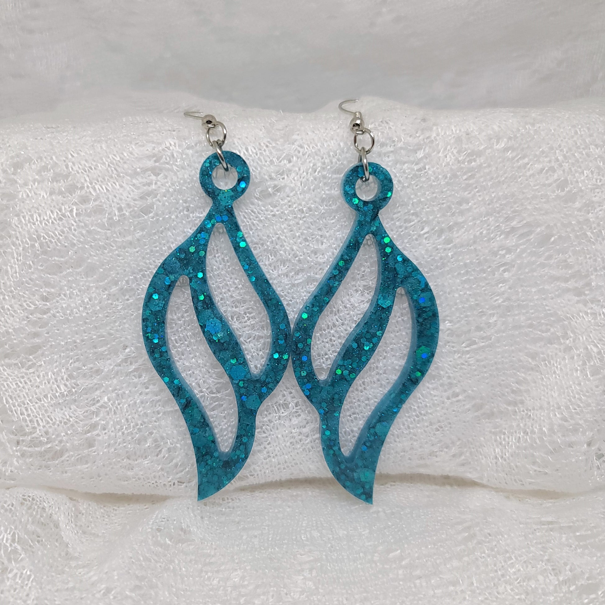 Blue Glitter Feather Shaped Dangle Statement Earrings, Wing Shaped