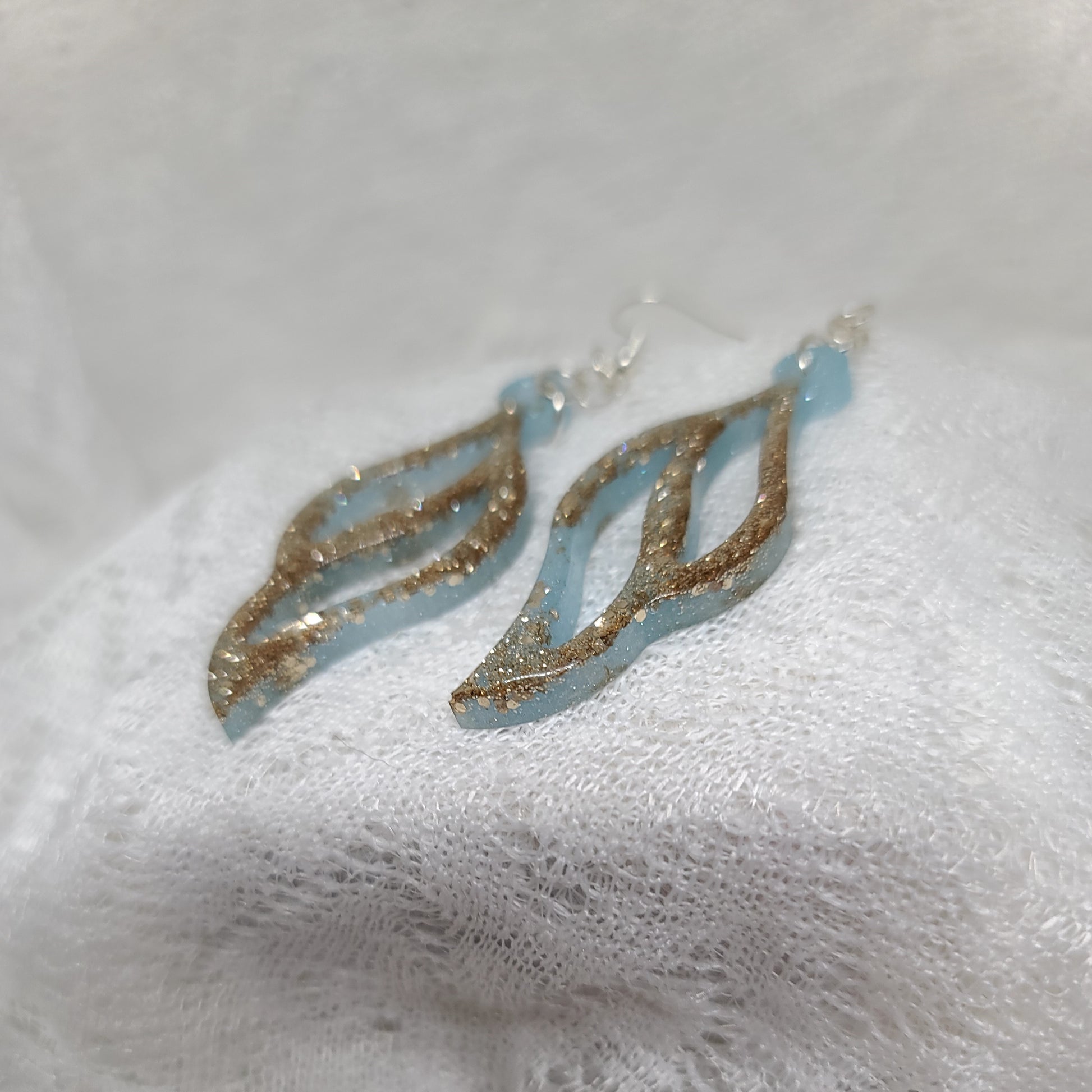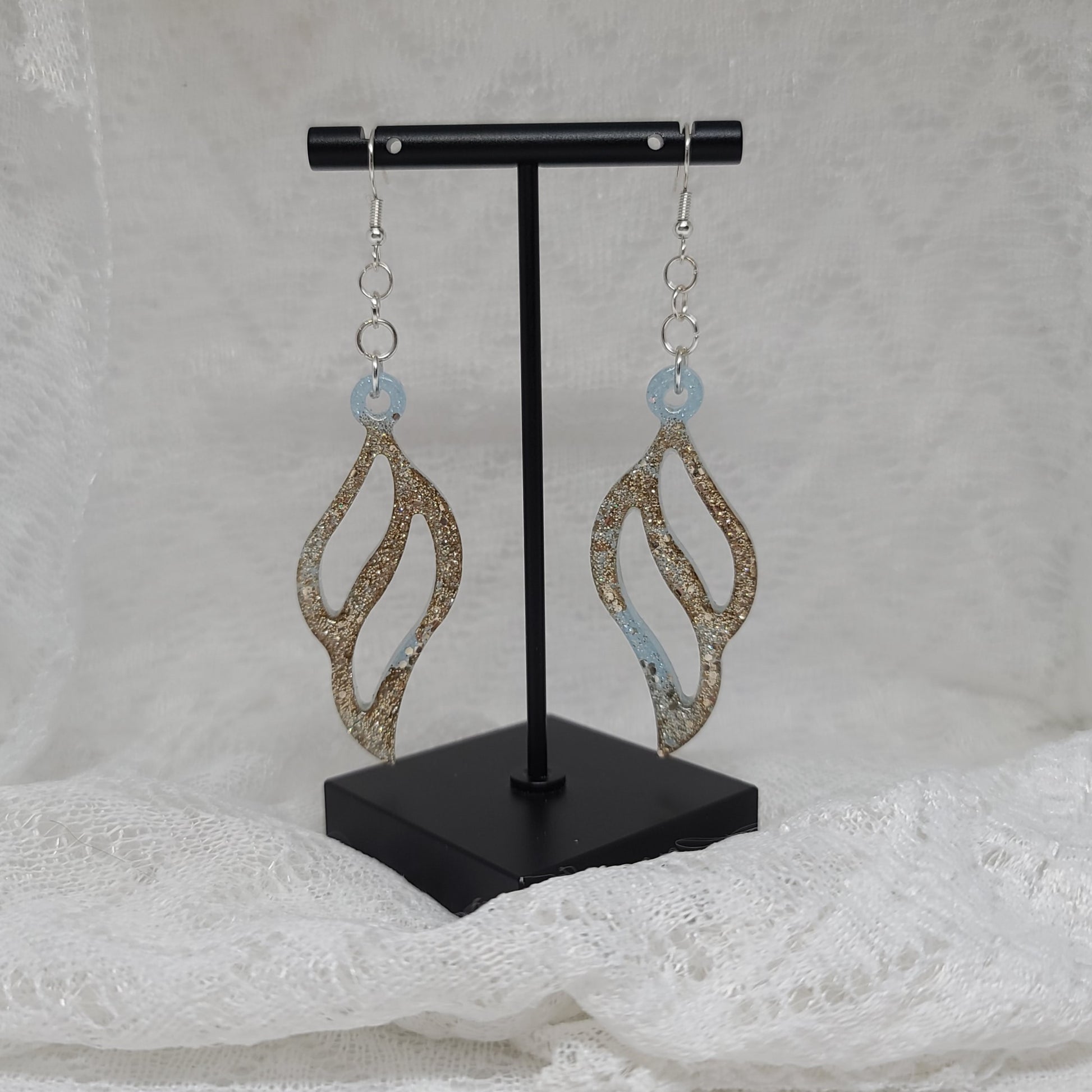 Gold Glitter Light Blue Tint Feather Dangle Earrings