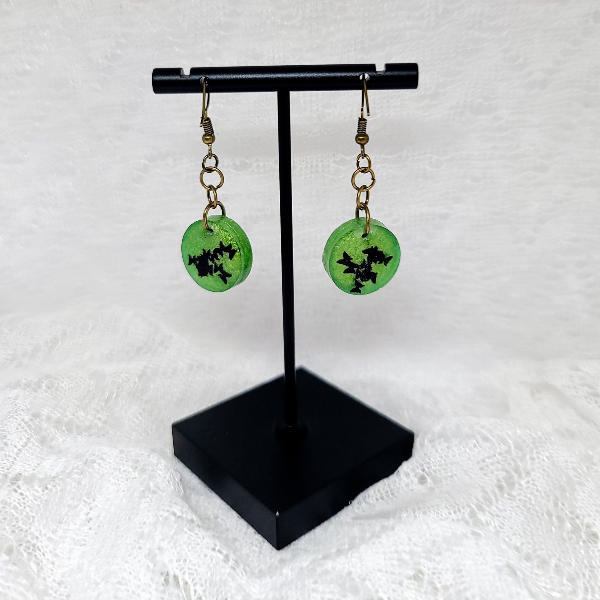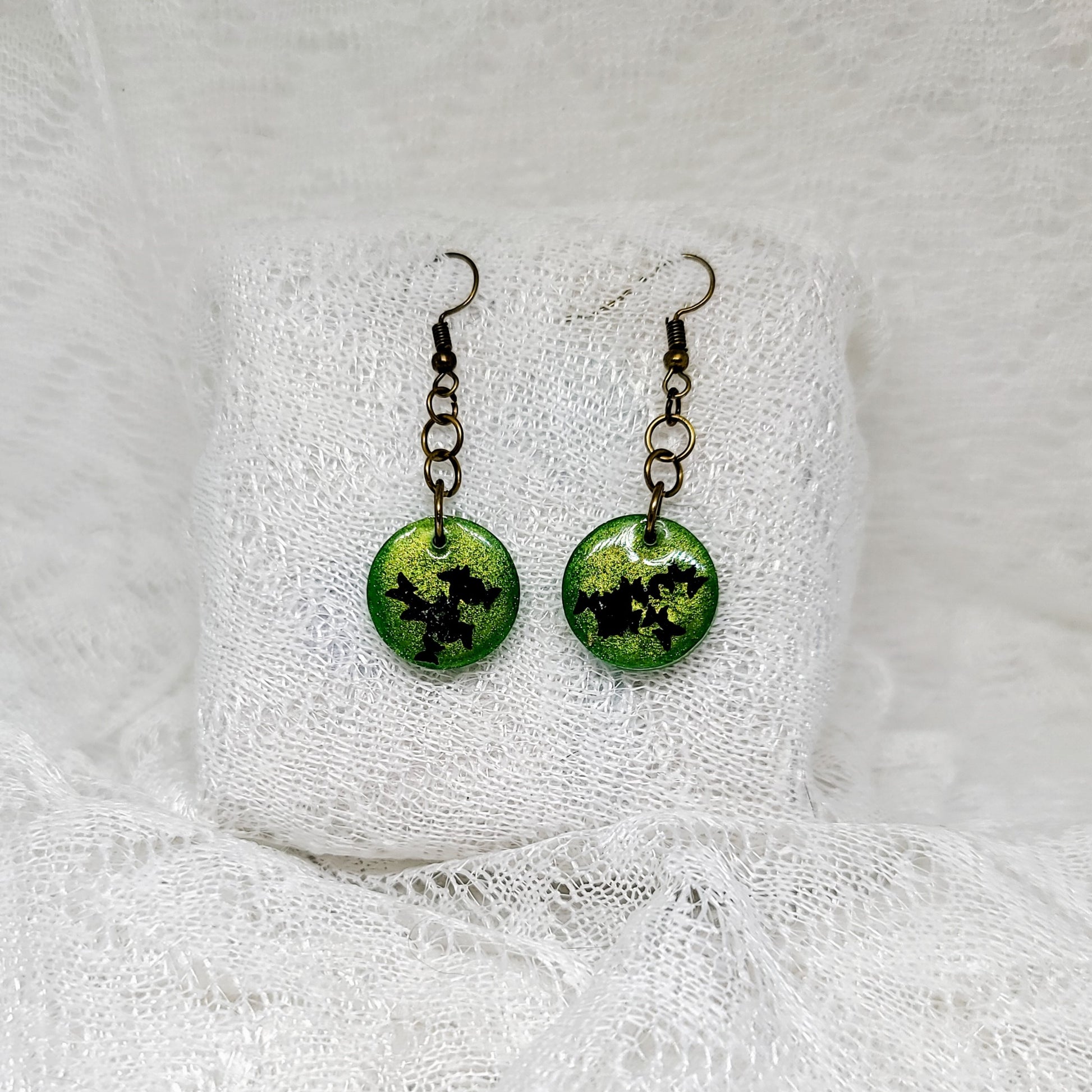 Green Shimmer With Black Butterflies Round Dangle Earrings
