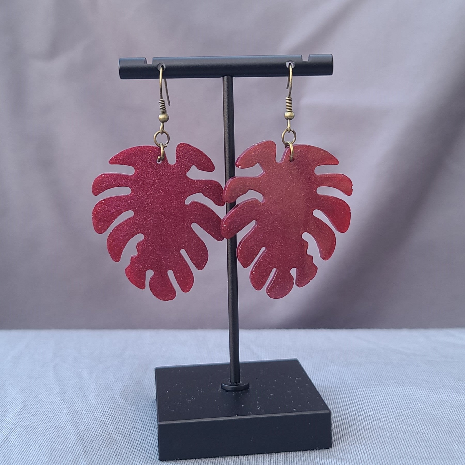 Maroon Red Monstera Leaf Dangle Earrings