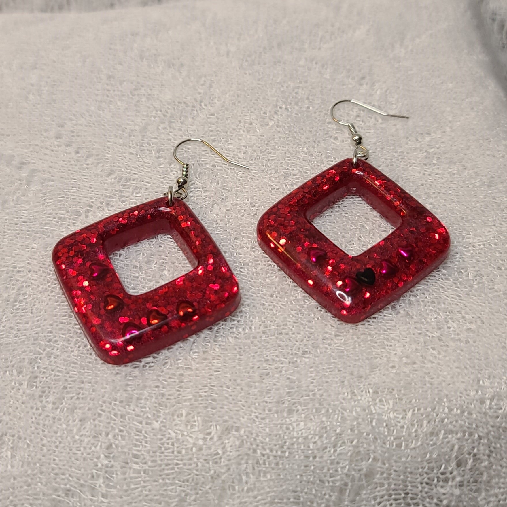 Red Glitter with Hearts Diamond Shaped Dangle Earrings